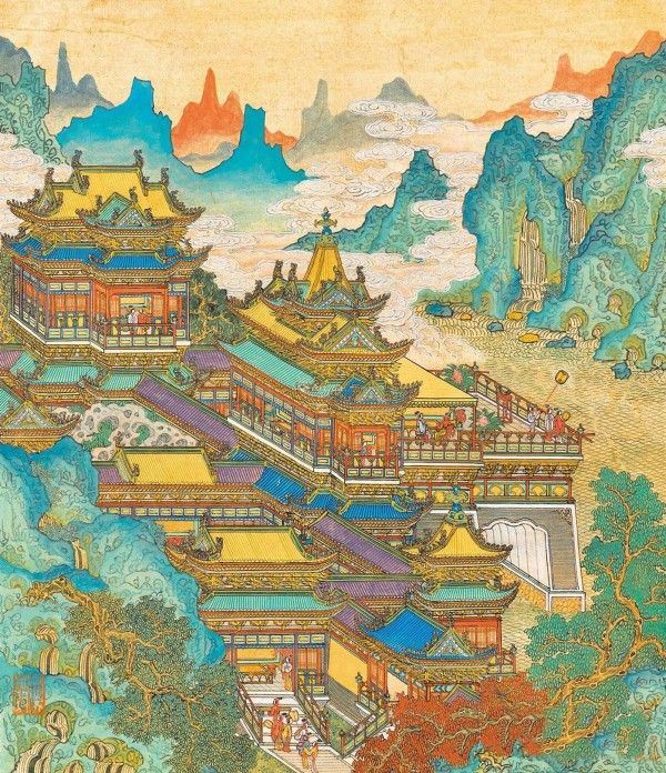 黄秋园《界画楼阁》作品介绍:纸本,设色,镜框;纵51厘米,横44.5厘米;藏于不详;钤印:长留天地间、秋园之画、窳瓠子。