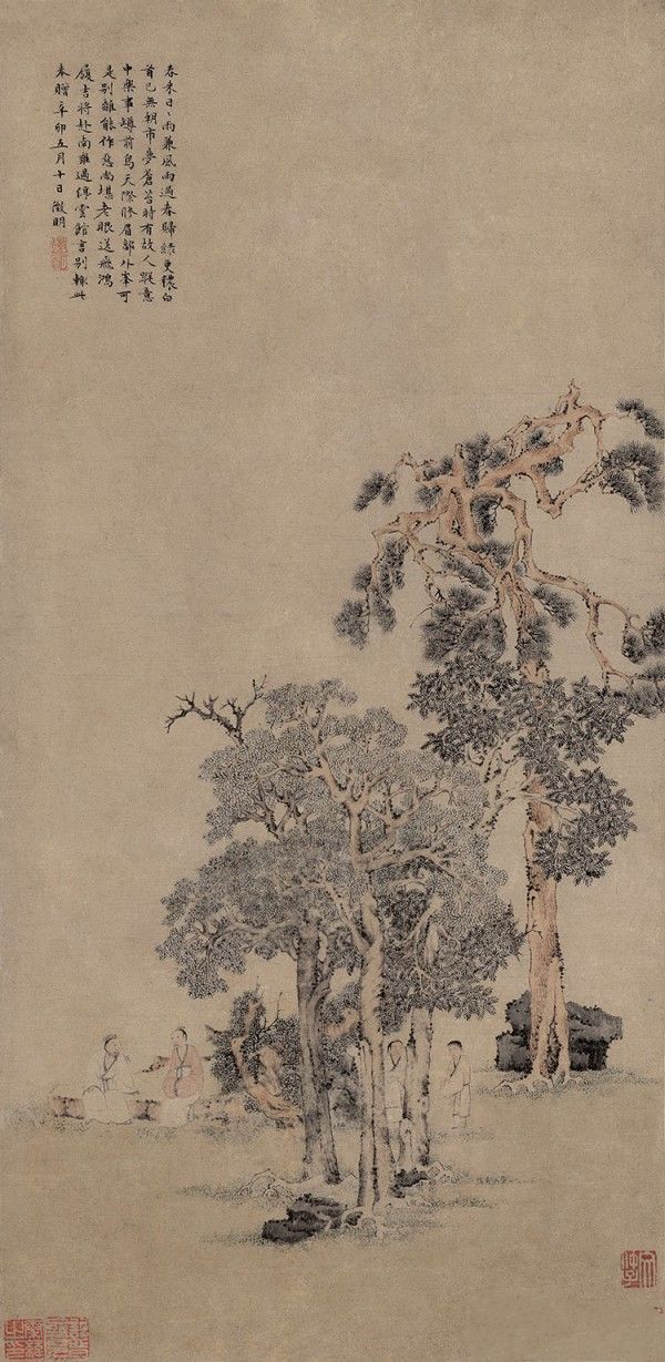 文徵明《送别图》:此作画柏槐三株,枝 虹结,皮老苍藓,右后为古松一株,高耸入云。树枝的伸展与相互穿插,树节的夸大明晰,为文氏晚年画法的一大特色。二高士踞坐左侧石岩上,一人端穆,另一人则旷达萧散,即征明与王宠的写照、二童捧物,隐立于树后。设色不多,以浅锋为主,树皮、人面、土坡悉用赭石染,赭墨分,仅一人衣略作朱色。