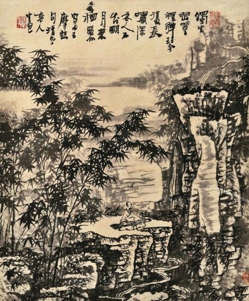 黄秋园《幽谷琴声图》:此作为黄秋园先生依唐代诗人王维诗意“独坐幽篁里,弹琴复长啸。深林人不知,明月来相照”而作,图中丛竹丰翠下,一隐者坐山间台地上临流抚琴,一侧顽石累累,一侧崖壁峭拔,由右上侧起,一条山涧盘曲而泻至左下,贯通整前后左右之境,上下处云树纷染披靡,典型的对角式构图,几乎是诗作内容的完全翻版造境。作品画面结构简洁疏阔,笔墨呈现率性流美,显见出画家的自适欣愉之态。