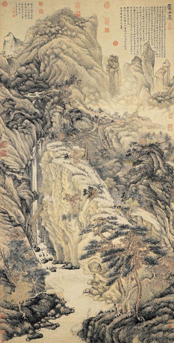 沈周《庐山高》:此作为沈周41岁时为祝贺老师陈宽七十寿辰而作,是他艺术转型期的典型之作。作品仿王蒙笔法,图中山峦层叠,草木繁茂,气势恢弘。画面右下角山坡,两棵劲松虬曲盘缠,形成近景;中景以著名的庐山瀑布为中心,水帘高悬,飞流直下,两崖间木桥斜跨,打破了流水飞白的呆板,两侧 岩峭壁,呈内敛之势。瀑布上方庐山主峰耸立,云雾浮动,山势渐入高远。构图由近景的山坡虬松,中景的瀑布、 岩、峭壁,远景的庐山主峰,自下而上,由近及远,近、中、远景相连,一气呵成,贯串结合而形成S形曲线。这种构图法很像南宋院体的程式;近景的处理也和马远的“一角”之景十分相似。全国群峰直插,回环掩映,争奇竞胜,实在是大家手笔。此图作者自识“庐山高”篆书,并题古体长歌一首,末识“成化丁亥端阳日,门生长洲沈周诗画,敬为醒庵有道尊先生寿”。陈宽字孟贤,号醒庵,学识渊博,工诗。具唐人法,亦善绘画,曾为沈周师。陈宽祖上是江西人,所以此图写庐山之“高”,以为象征。题识:“庐山高,高乎哉!郁然二百五十里之盘踞。岌乎二千三百丈之 。谓即敷浅原。培嵝何敢争其雄?西来天堑濯其足,云霞旦夕吞吐乎其胸。回崖沓嶂鬼手擘,涧道千丈开鸿蒙。瀑流淙淙泻不极,雷霆殷地闻者耳欲聋。时有落叶於其间,直下彭蠡流霜红。金膏水碧不可觅,石林幽黑号绿熊。其阳诸峰五老人,或疑纬星之精坠自空。陈夫子,今仲弓,世家庐之下,有元厥祖迁江东。尚知庐灵有默契,不远千里钟于公。公亦西望怀故都,便欲往依五老巢云松。昔闻紫阳祀六老,不妨添公相与成七翁。我常游公门,仰公弥高庐。不崇丘园肥遁七十,著作 白发如秋蓬。文能合坟诗合雅。自得乐地於其中。荣名利禄云过眼,上不作书自荐,下不公相通。公乎!浩荡在物表,黄鹄高举 天风。成化丁亥端阳日门生长洲沈周诗画敬醒庵有道尊先生寿 ”