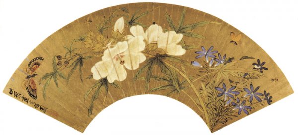 陈洪绶《花卉草虫扇面》:此作绘花卉和数只彩蝶,花及蝶的画法均极工整,花用粉多次轻染,分出浓淡,再用工笔勾勒,烘托出花瓣的肥厚、白嫩;蝴蝶先用轻细的线条勾出轮廓,用淡墨轻色逐层晕染,刻画精确。画幅构图大胆新颖,平稳巧妙,设色明丽温和、层次细腻、变化微妙,在赭色的绢底上更显典雅端丽。