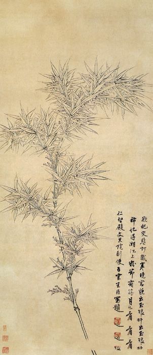 王臣《双钩竹图》:王臣是明代的画竹名家,此作为一白描双勾竹图。图中画一竹枝自画面下边斜出,弯曲向上,顶端又低头朝下,中间丛叶左右生长,取得舒展均衡之势,写物虽简,但构图却极精心。画中笔法清隽硬朗,描绘物象尽其精细。清人庞无济曾云此图“用笔如铁画银钩,似在王元章之上”。又云“此图书画俱古,疑为宋人手笔”。