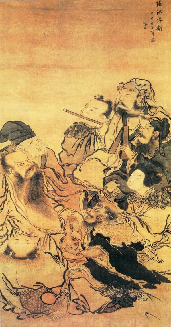 张羽中《瑶池仙剧图》:此作描画的是中国神话传说中的八仙铁拐李、汉钟离、张果老、韩湘子、何仙姑、蓝采和、吕洞宾、曹国舅等形象,写八仙聚乐于瑶池,皆头插花枝,吹乐观鹤,闲适逍遥;或吹笛,或击节,或聆听。神态生动,特点鲜明,笔墨粗犷有力,构图别致。