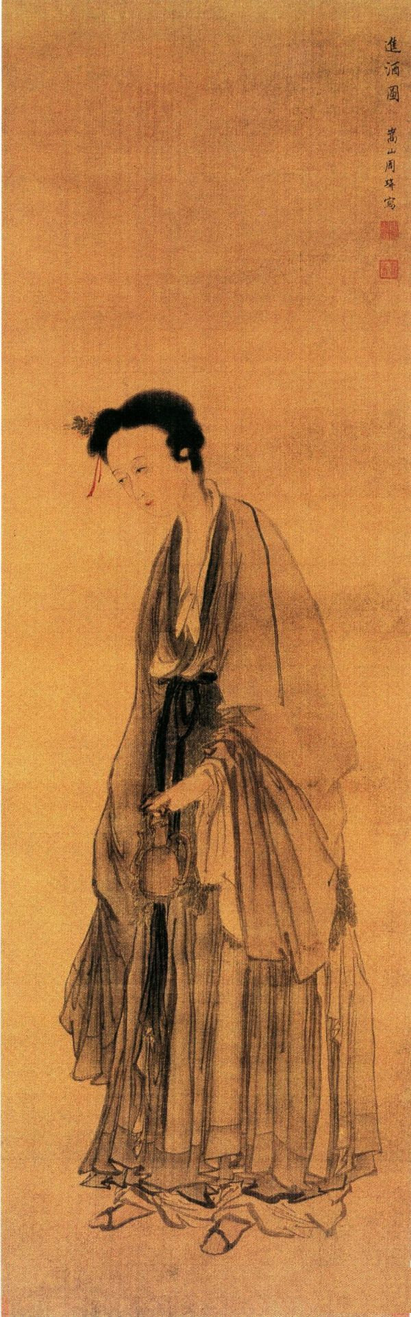周王寻《进酒图》:在这件作品中一女子提酒壶作进酒状,低首缓步,神态凝迟,复似谦恭。眉目清秀,丰润秀雅,发上簪花,腰佩绿叶裙装,足着草履,宛若仙姑。面部线条纤细,渲染微妙,衣纹繁复,略觉累赘,但枯笔湿染有燥润相得之趣。