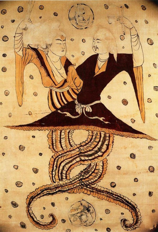 佚名《伏羲女娲图》:此作出土于新疆哈拉和卓古冢,描绘的是中华文化中的著名人物女娲和伏羲。图中羲、女娲分别呈男女形象侧身相对,各扬举一手,伏羲执矩,女娲执规,另一手各抱对方腰部,下半身作蛇形交绕。画面上部绘日,中有三足鸟,下部绘月,中有玉兔、桂树、蟾蜍。满幅大小不一的圆点代表天宇星宿。伏羲女娲为中国神话中人类的始祖。传说伏羲女娲为兄妹,相娠而有人类。此画线描沉郁舒缓,色彩单纯和谐。日月星宿的布置,既有空间的高远空旷之感,又显示了伏羲女娲作为人类始祖的崇高意味。