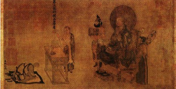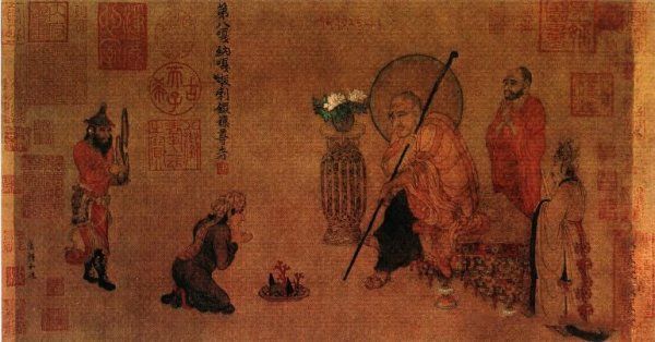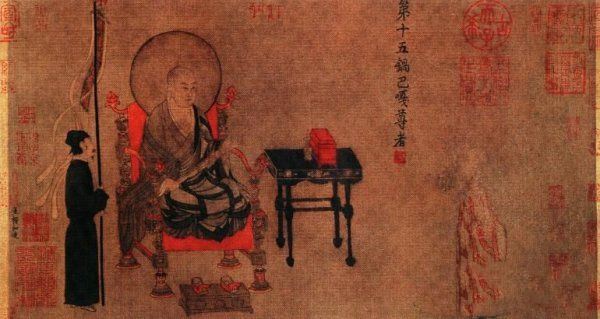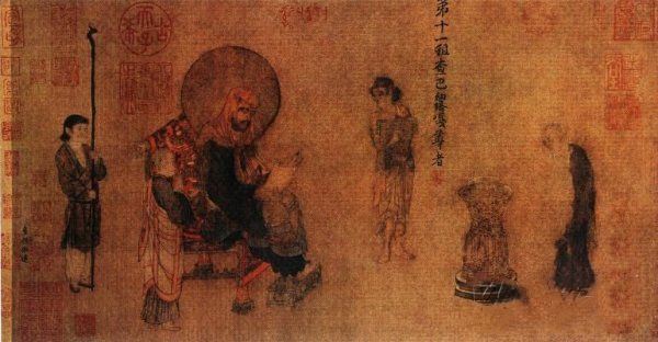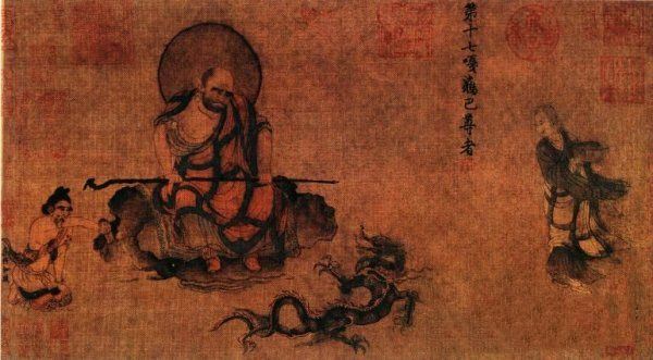 卢棱伽《六尊者像》:卢棱伽为唐代著名画家吴道子的弟子,他画风细致,咫尺之间,能画得山水辽阔,形象精备。尤擅佛像、经变,画过许多壁画。此《六尊者像》被认为是他《十八罗汉图》的留世部分。图中的六尊者分别是拔纳拔西尊者、嘎纳嘎哈拔喇镊襟尊者、租查巴纳塔嘎尊者、锅巴嘎尊者和俗称降龙、伏虎罗汉的嘎沙雅巴尊者、纳纳答密答喇尊者,均列位于十八罗汉之中。作者采用游丝描勾画人物,具有较鲜明的特色,线描流畅,具有较强的力度与柔韧性,动感较强烈,设色浓艳,艺术水平较高。人物气势恢宏、超尘脱俗,显示出早期佛教人物威严尊贵而又带有世俗化的特点。《六尊者像》的创作技法比较古老,人物形象塑造略带夸张,在表现人物“神”的方面尚不尽完美,这一切都显示了道释人物画自唐、五代至宋发展的水平。