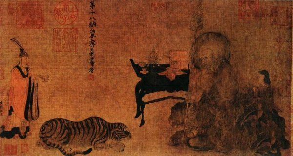 卢棱伽《六尊者像》作品介绍:绢本,册页,设色;纵30厘米,横53厘米;藏于北京故宫博物院。