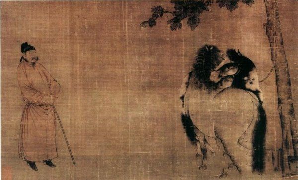 佚名《相马图》:作品描绘一红衣执杖者相马的情景。拴于树干上的二马,剽悍矫健,站于一旁的相马,者仪态庄重,眼光中流露出赞许的神情。此图画面简洁,不作背景,主体突出。人、马造型准确生动,线条取法李公麟,简劲冷敛,富有韵味,设色清润淡雅。画风与任仁发、任伯温鞍马画相近, 当为元代鞍马画高手所作。