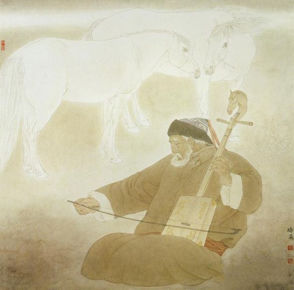 张鸿飞《草原牧歌》:张鸿飞的这幅《草原牧歌》,是他从自己独特的视角,以自己的理解,运用诗意的造型语言和娴熟的技巧谱写的一曲草原赞歌。画中老牧民拉着马头琴,似乎沉浸在一种辽远的追忆中;背景上用淡墨渲染而成的旷阔草原上似乎飘荡着亘古不变的音韵,而这音韵又包裹着以简洁细劲的线条勾勒而成的两只默默相对的白马,构成一种朦胧的诗意。在这童话般的朦胧中,观者辨不清那白马究竟是草原上正在牧放的真实之马还是老牧民心中之马。或许,这正是画家所要传达给观者的感受吧。(艺术点评:刘永胜 来源:大连图书馆)