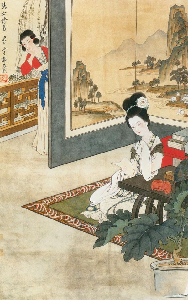 郭慕熙《慧女传书》:郭慕熙女士的这件作品取材于中国著名的古典名著《西厢记》中红娘为张生、崔莺莺传递情书的故事。作品中画家采用工笔重彩的形式,深入、细致地刻画了红娘与崔莺莺各自不同的神态表情。图中红娘躲在屏风的后面,调皮地探出半身,偷偷观察崔莺莺观看情书的表情。崔莺莺读信时神情专注而又有些羞怯,完全沉浸在爱情的甜蜜之中,根本没有发觉红娘在偷看自己。这幅画充分利用了地毯、桌几、屏风和栏杆的形式特征来分割画面空间,使人物的细腻柔和与环境直线的方正规矩形成对比,更好地衬托出了人物的性格特征。