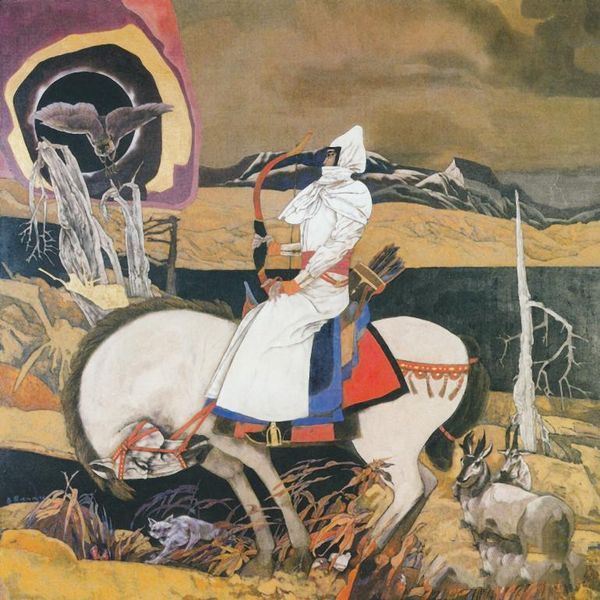 秦龙《孤独——我忧伤着你的忧伤》:在这件作品中画家鉴了装饰画、水粉画的表现方法,与传统工笔画技法相结合.描绘了一个骑马猎人四处漂泊的孤独生涯。猎人造型用线较多,既突现出独行者民族服饰上的特点,也显露出凝重的伤感情调。在材料上的综合运用有利于营造环境的荒凉和表现画中“孤独”所传达出的文学内容和精神内涵,确定了《孤独——我忧伤着你的忧伤》昕刻意表现的主题和所要揭示的意蕴,弥补了画面故事情节和习惯符号语言的不足之处,这必然会引起画中人情感的外泄和观者心理激荡之间的契合和共鸣。