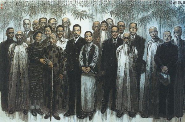 赵华胜《肝胆相照》:此作为赵华胜先生为纪念抗战胜利50周年而作。作品以群像式的构图,再现了—批与中国共产党共命运、同存亡的民主人士的形象。画家尊重历史真实.表现西安事变之后,周恩来同志代表中国共产党与各民主党派的仁人志士一起,共商组成抗日民族统一战线的大业。画中人物均是真人的写照,形象鲜明,个性突出,神形兼备。