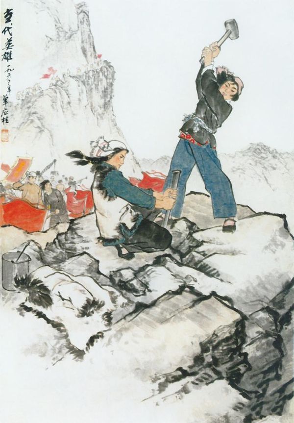 单应桂《当代英雄》:画此画反映了50年代末、60年代初中国农村青年为建设社会主义新农村的精神风貌。 作者创作此画时为中央美术学院四年级学生,指导老师为叶浅予。1 959年冬作者到北京房山县深入生活,见农民们正在引水上山,作者在和女青年们共同劳动中,被她们那种为改变农村落后面貌、不畏艰难的精神所感动。年轻的姑娘高高举起的大锤、健康且流着汗水的脸颊,被山风吹起的发辫和飘起的头巾,一种充满活力的劳动美深深打动了作者。此作在工棚里完成了草图, 后又精心绘制而成,得到美术界的专家与同行的好评。(艺术点评:江冉 来源:大连图书馆)