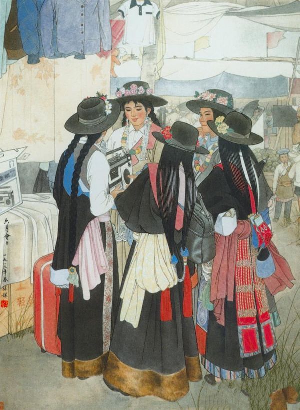 陈谋《六月会上》:陈谋先生喜欢创作关于少数民族的作品,此作便是其中比较有名的一件。作品描绘的是少数民族一年一度的集会。集会上商品应有尽有,琳琅满目。画面中央五个穿着盛装的少女在选购新式收录机,她们神情专注,画家重点刻画了两个女子的面貌和三个女子的服饰。画家对工笔重彩技法的熟练掌握使图中色彩艳而不火,用线准确有力.民族特色浓厚,服饰质感很强,具有浓厚的民族风情。