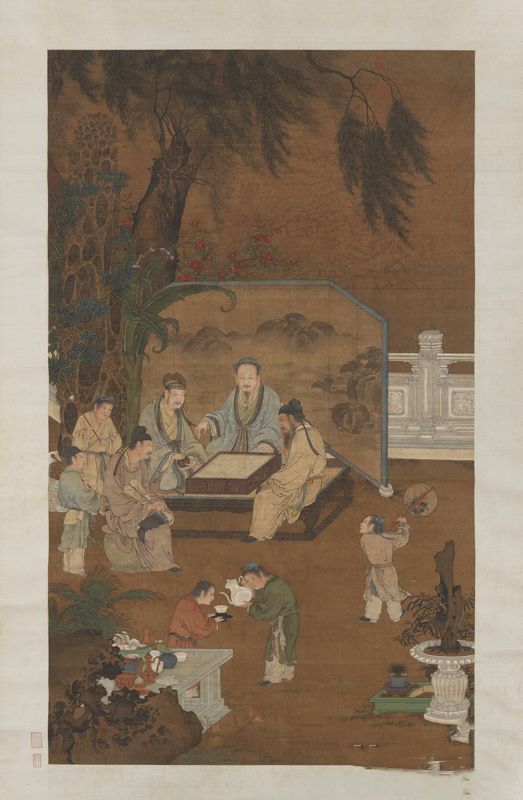 《明人十八学士图》之棋作品介绍 :立轴,绢本,设色;纵173.6厘米,横103.1厘米;臧品编号 故画00858;藏于中国台北故宫博物院。