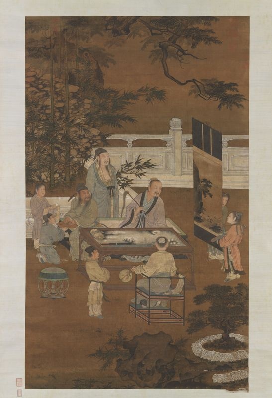 《明人十八学士图》之画作品介绍 :立轴,绢本,设色;纵174.1厘米,横103.1厘米;臧品编号 故画00859;藏于中国台北故宫博物院。