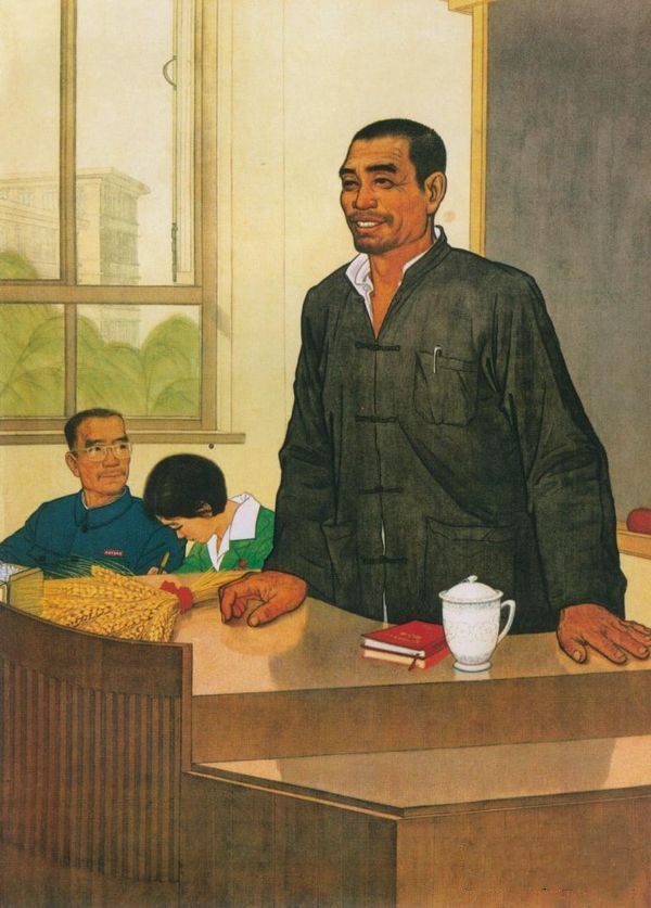 张文瑞《大学讲坛》:张文瑞先生的这件作品是一件具有浓厚的时代气息的作品。作品描绘的是一位具有丰富实践经验的农民在大学讲堂为大学生讲课的场景。作者以传统的工笔画法深入刻画一位憨厚、朴实的农民,是一位具备一定科学知识的典型农民形象。画面主体突出,设色明亮,从低头记录的女教师和教授转头的认真神情,以及老农自信的微笑,可以想象出教室内学生们听课的情绪。这是一堂生动的“教育与生产劳动相结合”的课。