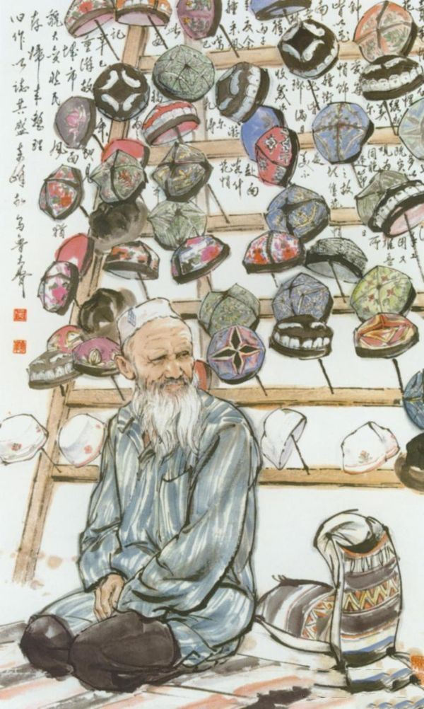 吴奇峰《卖花帽的老汉》:吴奇峰先生属于那种偏重于情感类型的艺术家,他善于从日常生活中寻找美的感受。这件作品是他去新疆游喀什噶尔花帽巴扎所看所感而作。作品描绘的是一位卖花帽的维吾尔族老人。图中帽架上各式花帽反映了当地的民情风俗。都来自于日常生活场景,十分生动。画家精心刻画了—位饱经风霜的维族老人朴实的形象,注入了画家的情感。这种情感自然而然地引导着画家大量地捕捉、速写生活中生动朴实的人和人的生活状态,并且把那些神貌各异的人物、场景几乎不加修饰或略加修饰地移植到作品中去。画家心里带着激情,努力使画面畅情达意,在笔、墨、色的交替中产生美感。