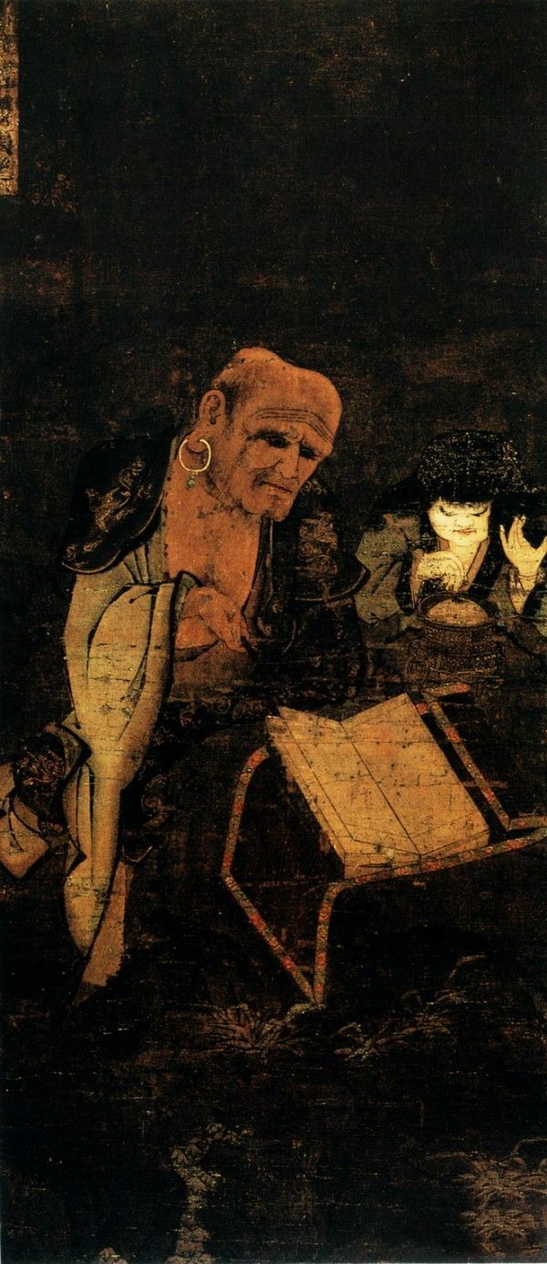 佚名《十六罗汉·第四尊者》:据传《十六罗汉》图是在宋代永延元年流入日本,时间虽至今还不能确认,但作品的风格特征,应是北宋时期的。十六罗汉中的第四尊者为苏频陀,他是佛祖生前的最后一位弟子。画中罗汉正伏石读经,旁边一个童子正在给香炉中填香,气氛安谧恬然。人物衣纹粗笔简括,但外袍、经书、香炉、人的五官,却描绘细致。画面工写结合,意韵悠长。