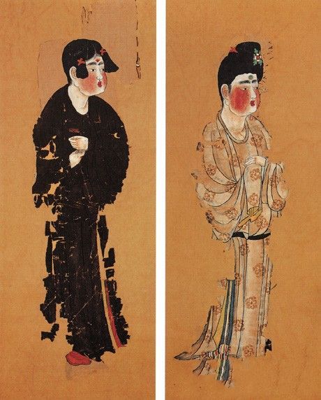 佚名《侍女图》:此作作者已佚,作品绘两侍女肖像,人物造型体态丰厚, 面颊圆润, 反映了盛唐时代的审美时尚,线条工细劲挺而流畅,设色鲜艳明快。一侍女头梳低鬟,身着圆领紫色长袍。另一侍发束高髻,簪花钿,穿圆领浅赭色印花长袍。