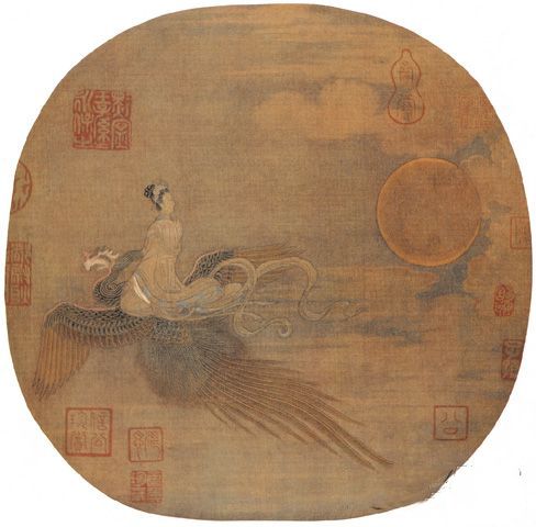 周文矩《仙女乘鸾图》:在这件作品中一鸾凤于薄云淡雾中振翅飞鸣,其背上一仙女正茫然回首目视身后的一轮圆月。画家将仙女回眸之一刹那所显露出的怅惘之情刻画的生动传神,使本来单调的景物变得极富情趣并给人以想像力。仙女的眼神原无形,然作者却利用它使圆月和鸾凤之间产生一种内在的呼应关系,使画面具有气脉贯通的完整性。画家通过描绘仙女的衣带向后飘举暗示出无形的风力,并以此表明鸾凤疾翔时的速度与强烈的动感,与圆月之间形成动与静的对比。在人物形象的塑造上,仙女的造型越出了隋唐时期仕女画丰腴健壮的体态,表现出女性身材比例合理,造型匀称的特点。作品无款,旧题周文矩作。对幅有耿昭忠题:“风格高妙,飘飘然有凌霞绝尘之姿,是盖周文矩胸中迥出天机,故落笔超乎物表。张、吴、顾、陆、何难继踵。”襄平耿昭忠题。”本幅及裱边、对幅钤耿昭忠“真赏”、“黔宁王子孙永保之”、“丹诚”、“都尉耿信公书画之章”、“信公珍藏”、“珍秘”、“宜尔子孙”、“公”等鉴藏印,共17方。 《圣朝名画评》云:“周文矩,建康句容人。美风度,学丹青,颇有精思。仕李煜,为待诏,能画冕服车器人物仕女。”又云:“周文矩用意深远,于繁富则尤工。”按此图虽无款,而作风飞动精丽,允为北宋早期的作品。