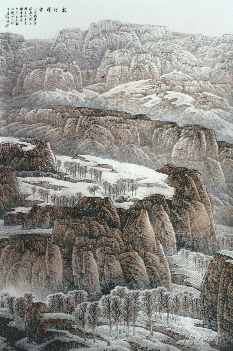 李明《太行晴雪》:此作表现出了太行的苍凉伟岸、雄浑博大,同时也显示了太行的浪漫与多娇。画家较准确地把握了太行那饱经沧桑与辉煌的人格化形象,使创作的格调定位较高。石涛大师的一句“笔墨当随时代”,道出了艺术创作的真谛。几百年来,一代代山水画家为这句经典之说付出了辛勤的汗水。探究笔墨与时代的关系,其实质乃是画家如何面对现实社会,如何更好地深入生活,挖掘创作素材,从而准确而巧妙地表现现实社会,正确把握其发展、进步的规律。