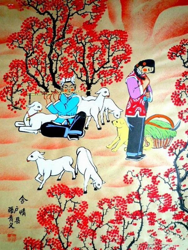 张青义作品介绍:张青义,1954年生于余下镇南索村,自幼喜欢绘画,1973年参加户县农民画创作学习班,迄今已创作作品千余幅。《山区大舞台》、《柳编》、《牧牛图》、《乡戏》、《新春》、《背火迎春》等作品先后荣获国家、省、市大奖,《瓜棚》被编入小学五年级美术教科书;《斗牛》、《农家练武》、《小院》、《夏夜》等曾在国内外多家报刊杂志发表。电台、电视台做过专题报道。2000年和2009来源画乡网年曾两次出访美国并成功举办个人画展。现为一级画家、中国农民书画研究会创作研究员、陕西省农民画协会常务理事、户县农民画协会副主席;张青义画室被县委宣传部、文体广电局命名为农民画之家、农民画作者辅导站、农民画庄,和国内多家旅行社建立起良好的业务往来,每年接待国内外宾客数千人。2008年通过农民画搭桥使美国“人民对人民”友好团体为本村学校建起一座13万元的图书馆。