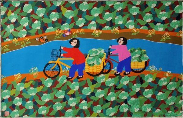 辛集农民画作品介绍:辛集农民画历史悠久,源远流长。早在明清时期,这里的人们就有画、绣、剪、编等,民间传统。五十年代,以壁画为主要形式的束鹿农民画,清新质朴,范围广泛,人民美术出版社曾经出版过《河北束鹿县壁画选》和《诗洋画海金束鹿》两本画册。1959年束鹿县农民画参加了德国莱比锡国际博览会。六、七十年代,农民画发展趋向文雅工细,注意造形,曾出版《河北束鹿群众业余画选》;。改革开放以来,辛集农民画这支画苑奇葩更加异彩纷呈,绚丽多彩,耿占雄、王小俊、胡双月、刘国英、赵新钮等一批农民画作者脱颖而出,在继承传统的基础上又吸收融汇了现代绘画的艺术营养,作品时代特征鲜明,生活气息浓郁,富有河北淳厚、粗扩、稚拙、绚丽的地方特色。