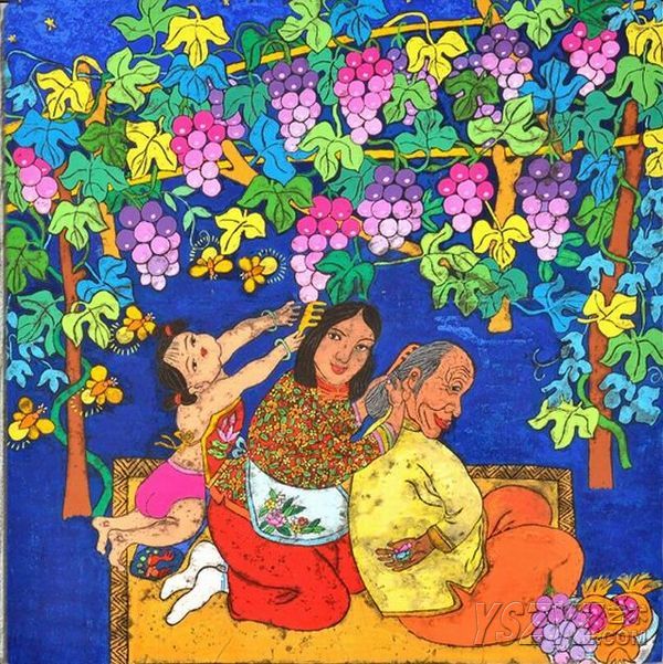 辛集农民画作品介绍:辛集农民画历史悠久,源远流长。早在明清时期,这里的人们就有画、绣、剪、编等,民间传统。五十年代,以壁画为主要形式的束鹿农民画,清新质朴,范围广泛,人民美术出版社曾经出版过《河北束鹿县壁画选》和《诗洋画海金束鹿》两本画册。1959年束鹿县农民画参加了德国莱比锡国际博览会。六、七十年代,农民画发展趋向文雅工细,注意造形,曾出版《河北束鹿群众业余画选》;。改革开放以来,辛集农民画这支画苑奇葩更加异彩纷呈,绚丽多彩,耿占雄、王小俊、胡双月、刘国英、赵新钮等一批农民画作者脱颖而出,在继承传统的基础上又吸收融汇了现代绘画的艺术营养,作品时代特征鲜明,生活气息浓郁,富有河北淳厚、粗扩、稚拙、绚丽的地方特色。