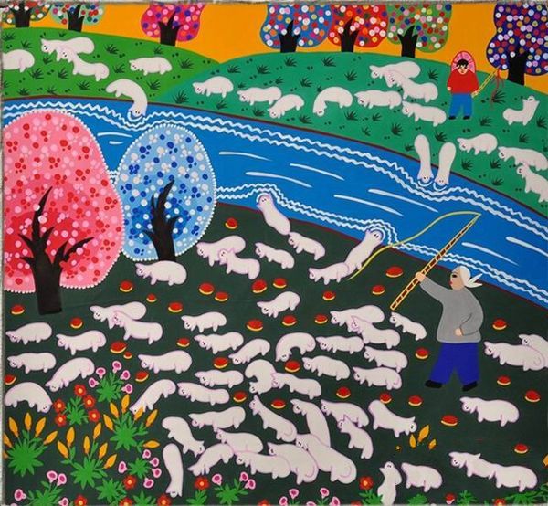 辛集农民画作品介绍:辛集农民画历史悠久,源远流长。早在明清时期,这里的人们就有画、绣、剪、编等,民间传统。五十年代,以壁画为主要形式的束鹿农民画,清新质朴,范围广泛,人民美术出版社曾经出版过《河北束鹿县壁画选》和《诗洋画海金束鹿》两本画册。1959年束鹿县农民画参加了德国莱比锡国际博览会。六、七十年代,农民画发展趋向文雅工细,注意造形,曾出版《河北束鹿群众业余画选》;。改革开放以来,辛集农民画这支画苑奇葩更加异彩纷呈,绚丽多彩,耿占雄、王小俊、胡双月、刘国英、赵新钮等一批农民画作者脱颖而出,在继承传统的基础上又吸收融汇了现代绘画的艺术营养,作品时代特征鲜明,生活气息浓郁,富有河北淳厚、粗扩、稚拙、绚丽的地方特色。 辛集农民画特点:
