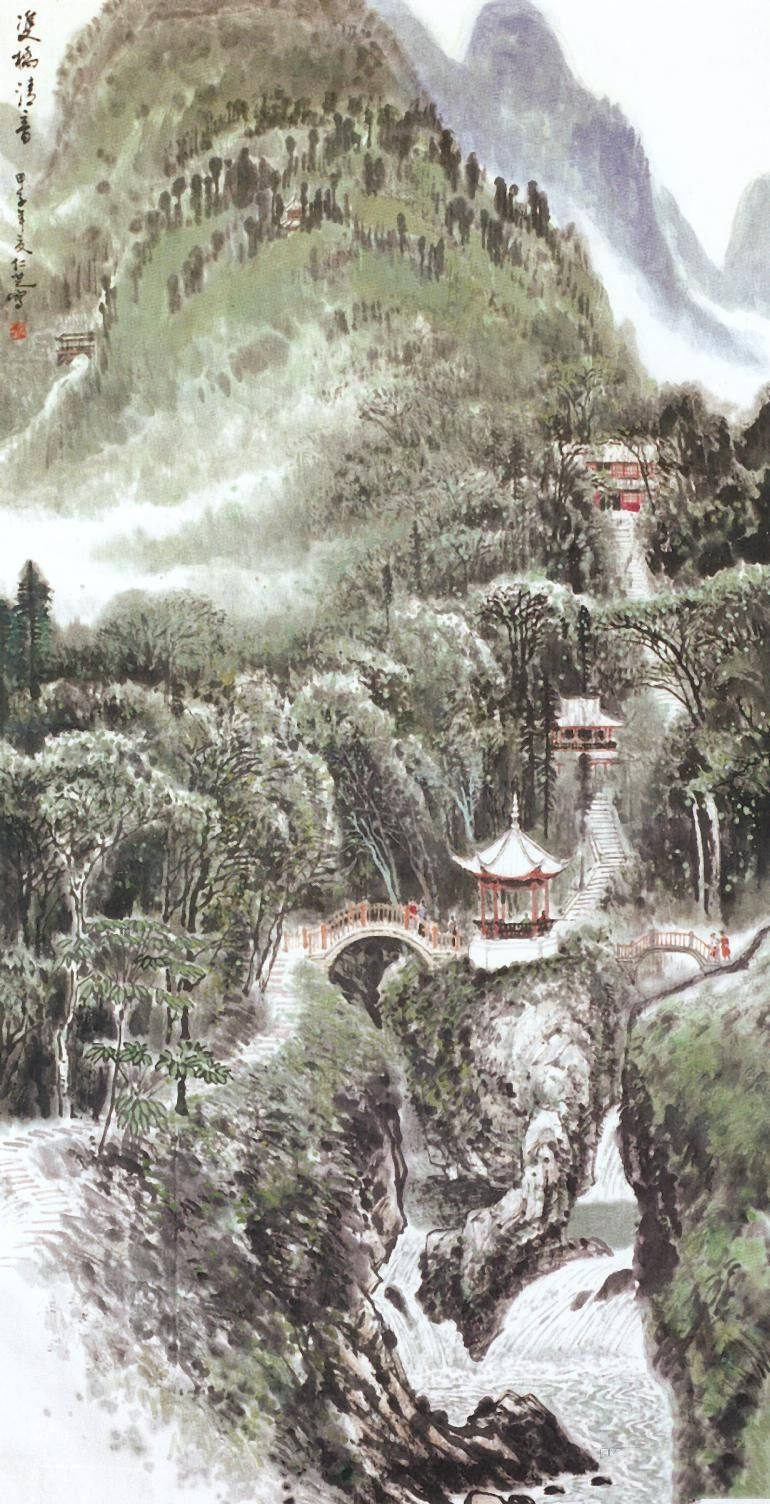 张仁芝《双桥清音》:张仁芝多年从事山水画创作,他非常重视写生,他的足迹踏遍大半个中国。在这件作品中山、树、小桥、亭阁、流水等组成的浑然一体的秀美的自然风光。画面一条山路弯弯曲曲,贯穿着小桥、亭子,一直向山的深处延伸,给人一种“曲径通幽”的感觉,整个画面较轻松,在使人享受到大自然秀丽风光的同时,带给观者一份安祥、恬静的心情。