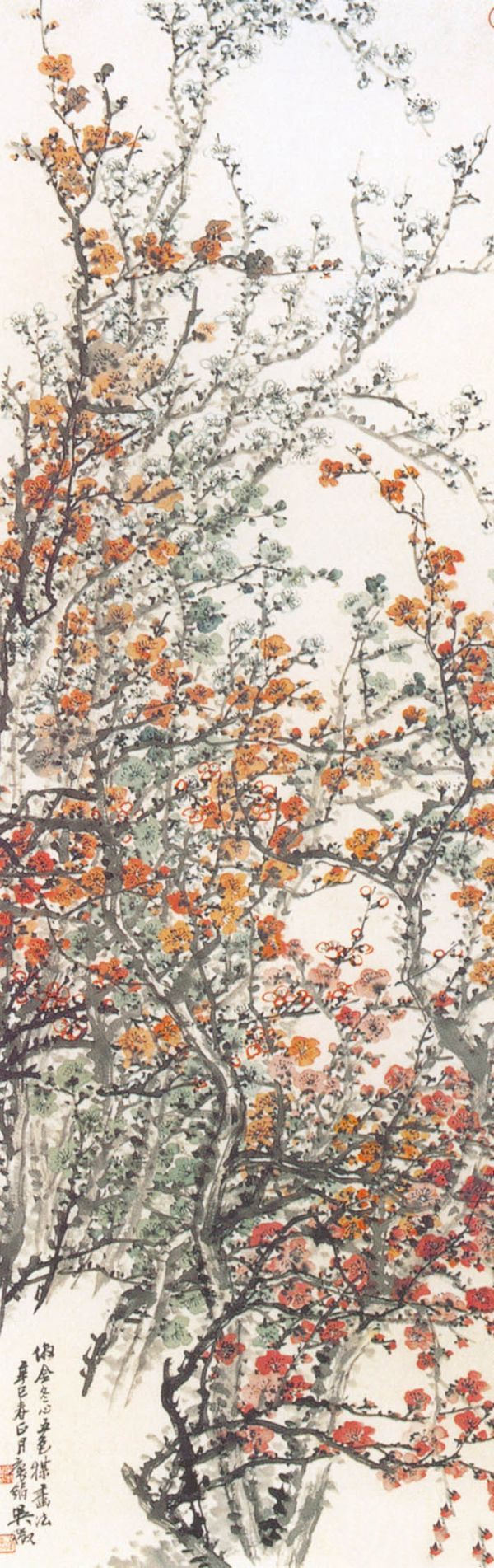 吴微《五色梅》作品介绍:纸本,设色;纵102厘米,横34厘米;作于1941年;藏于北京荣宝斋。