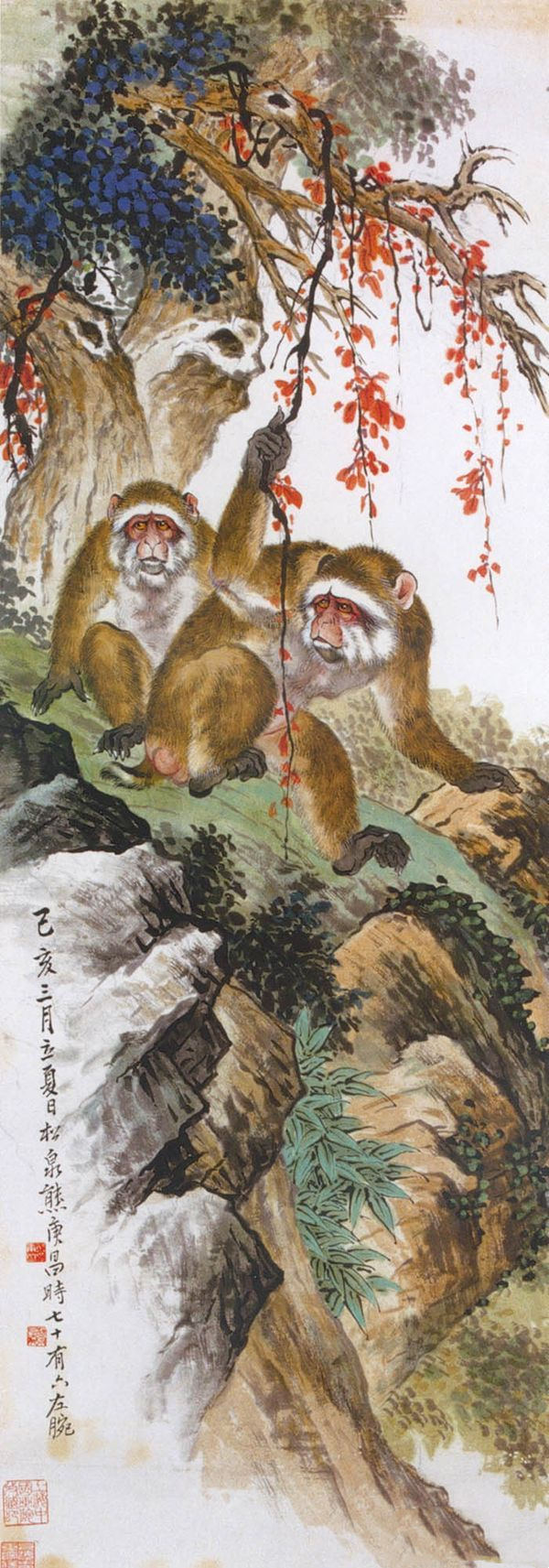 熊松泉《双猴》作品介绍:纸本,设施;纵116厘米,横41厘米;作于1959年;藏于上海中国画院。