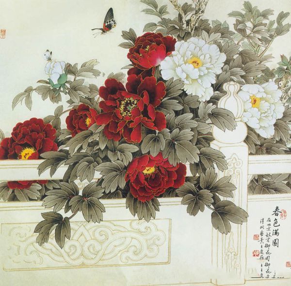 王庆升《春色满园》 :此作为王庆升先生的 花鸟 精品之作,参加了“第六届全国美展”。作品传统的 工笔 手法描绘花团锦簇、枝叶繁茂的故宫御花园听见之景。牡丹花、叶被玉石栏杆所阻,强行出枝,春色满园之意已点出,并以此形成疏密与色彩的对比,使画面富有节奏。勾线用笔细润劲利,颇具功底;枝叶、花束俯仰有致,变化丰富;著色渲染深浅不一,淡叶与浓花构成强烈的对比,艳而不俗,秀丽而清雅两只蝴蝶飞旋其上,更点明了主题和增添了画面情趣。
