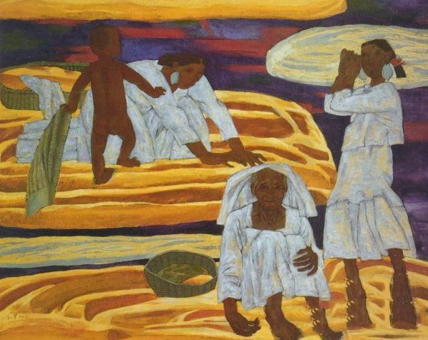 【晒谷】:这幅作品是作者为怀念自己的祖母而怍,画中老人的形象是依祖母生前的照片摹画的此画也是作者初次对岩彩新材料的探索。画面通过岩彩本身材质的特有美质,用热烈的补色效果,透过晒谷场这特定环境的劳作场面,表达老少三代人相濡以沫的亲情。我们可以从画面中感受到中国劳动妇女勤劳质朴、哺育操劳的善良天性。这也是作者想要传达给观者的初裹。