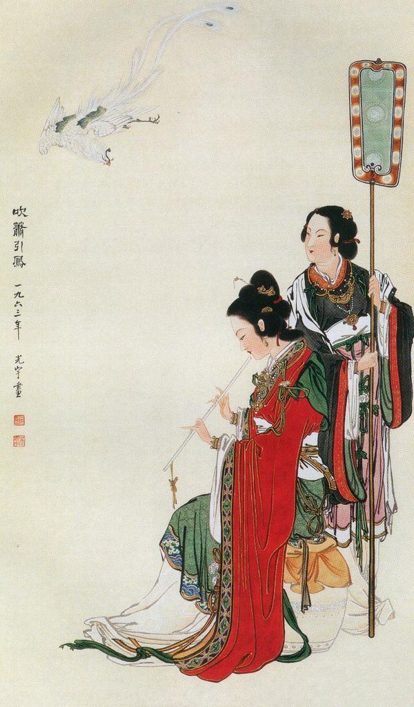 【吹萧引凤】作品介绍:1963年,绢本设色,103cm x 79cm。中央美术学院藏。