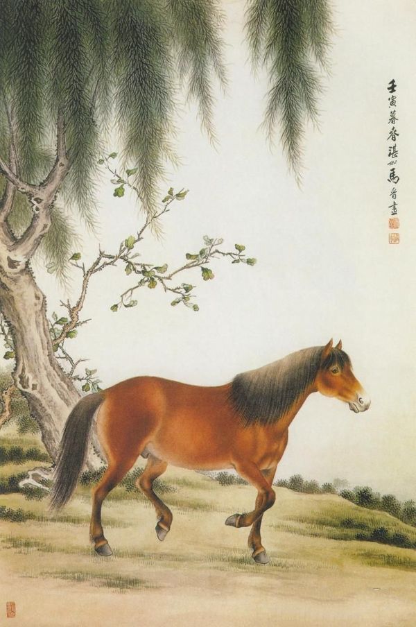 【马】:清代从康熙到乾隆年间,受外国传教士郎世宁、艾启蒙等的影响,糅合中西的画法,逐渐形成一种新派绘画,即纯以西洋画的表现手法画中国画,独具面目。马晋的《马》明显地具有这种风格。图中树干、枝丫还保留一些中国传统绘画的特点,而柳叶、草坡就有一些西画的味道,至于全图的中心——马,则纯粹是按照西画的明暗、结构来表现,骏马毛皮溜光,马鬃纷披,正在慢跑。画中的构图、透视也是折衷中西。可见,这种糅合画风在社会上还是有一定的影响