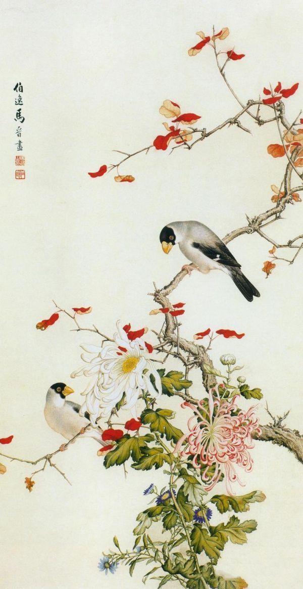 【秋菊梧桐鸟】:中西文化的交流,在有些方面不易察觉,需要时间的磨合和文化结构的碰撞;但在有些方面表现也很明显,比如直接作用于视觉的绘画,有一定鉴赏力的人一眼便可了悟其差别。马晋的画就具有这个特点,他的画在整体构图、章法等方面基本上还是传统的,但细节上就具有西画的立体感、明暗关系、光影等因素。《秋菊梧桐鸟》其绘画精神,包括画题、作品意蕴、构图程式都是中国画应有的,但鸟类、树枝、叶片、菊花、菊叶没有受过系统西画训练的人是绝对画不出的,这也说明这种新派绘画在民间还是有一定群的,值得研究