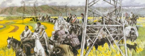 【青藏高原】:笔墨生命的延续和发展只能在对生活的再表现中去过渡,笔墨所具有的表现性、健康性和可变性必须从生活实践中来,这样才能创造出无愧于时代的伟大作品。《青藏高原》是一幅近达4米的巨作,场面宏大,人物众多,境界深远。作品中人物造型的整体概括取代了以往于物象的细微刻画;水墨为主的人物造型与背景的空间展示取代了一招一式笔墨技法的自我陶醉;线、面和肌理构成的节奏对比形成了新的平衡;用墨、用色、用笔形成了新的视觉效果和对比精神,表现了画家扬弃旧我、拓展新我的执著创作态度和对伟大时代的歌颂。