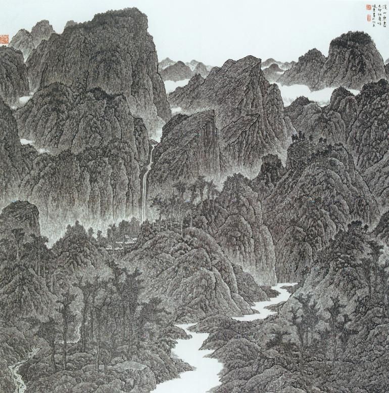 崔晓东《溪山无尽》:崔晓东先生生于1953年,中国现代著名画家,他擅长山水画,作品继承了中国正统的山水画传统,画风纯正典雅,自然深厚。对宋、元、明、清诸大家均有较深的研究和借鉴,特别在笔墨语言上千锤百炼,掌握了扎实的专业基本功,并在继承传统的基础上逐渐地形成了自己浑厚凝重,格调高古的艺术风格,受到画坛瞩目。此作为他的代表作品之一,作品构图平稳中见奇雄,画家善于处理大与小、疏与密的辩证关系。笔墨处理则是皴点相间,画积点为面,点显线隐。他没有融入过多的主观成分,而是着眼于传递“实境”的图式。他借助传统的三远透视法则完成构图,体验古人所说的“真境逼而神境生”并以此导引自身的山水创作。