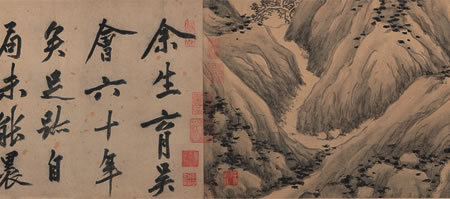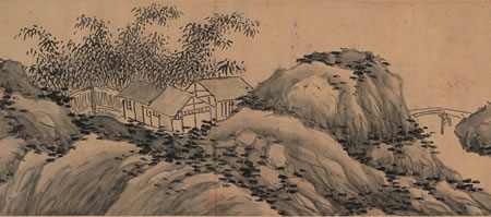沈周《西山纪游图》:此作为沈周的传世名作,是沈氏笔墨风格的代表作品之一。作品是沈周纪游苏州洞庭西山的景色而作。图中溪山连绵,山径曲折逶迤,悬瀑急湍,长桥横贯,茫茫太湖,雄伟壮阔。湖面上小舟荡漾,竹坞村舍依山而筑,曲尽湖山诸景之胜。山石用披麻皴,用笔劲健朴拙,墨色苍润松秀,气势宏畅。