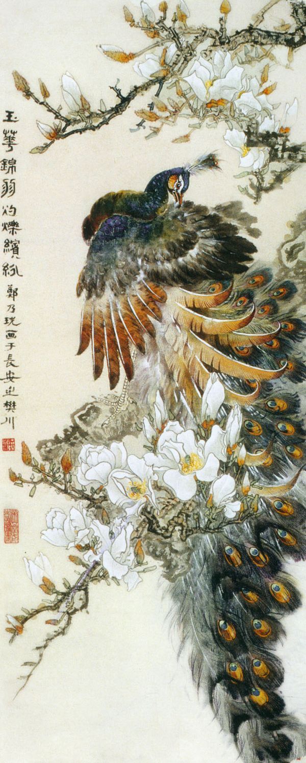 郑乃 《玉花锦羽》:此作为郑乃咣先生的传世名作之一,作品描绘一个色彩鲜丽的孔雀立于一株玉兰花枝上,舒身剔羽,意态悠闲,斑斓的雀羽和淡雅的玉兰花在对比中形成清雅鲜丽的画面效果。玉兰花老干道枝,花朵或含苞欲放,或娇嫩妍开,尤其是前面的一丛花枝,白花以藤黄点蕊,在后面孔雀鲜羽的映衬下,更显皎洁。全画构图饱满,勾勒晕彩一丝不苟,充分发挥了线在造型中的骨架作用,以线准确地表现出复杂多变的艺术形象,把孔雀剔羽时丰富的羽毛变化刻画得轻松、快意,显示出画家深厚的传统功力。
