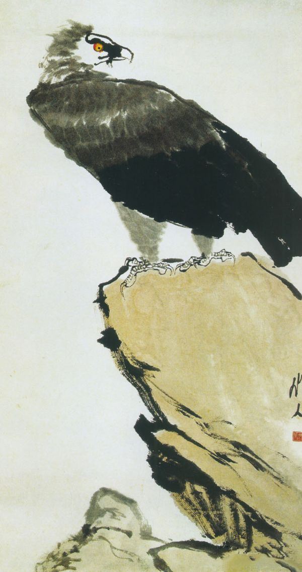 吴作人《鹰》:吴作人先生是中国著名画家,师从徐悲鸿先生,深受徐悲鸿的影响。此作便是其师学渊源的例证。图中那只回首苍鹰,无论造型还是笔墨,抑或布局、韵味,都明显能看出徐悲鸿所画秃鹫的影子。当然其中也有作者自己的笔墨造型。比如石块上的用笔以侧锋出之,不似其师多以中锋运笔。另外作者在品性上的宽和使其作品始终透露出一股简约、平和、宽厚、清新的气质。