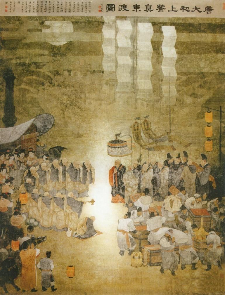 谢振瓯《唐大和尚鉴真东渡图》作品介绍:纸本,设色;纵184厘米,横l40厘米;作于1996年;藏于画家自藏。