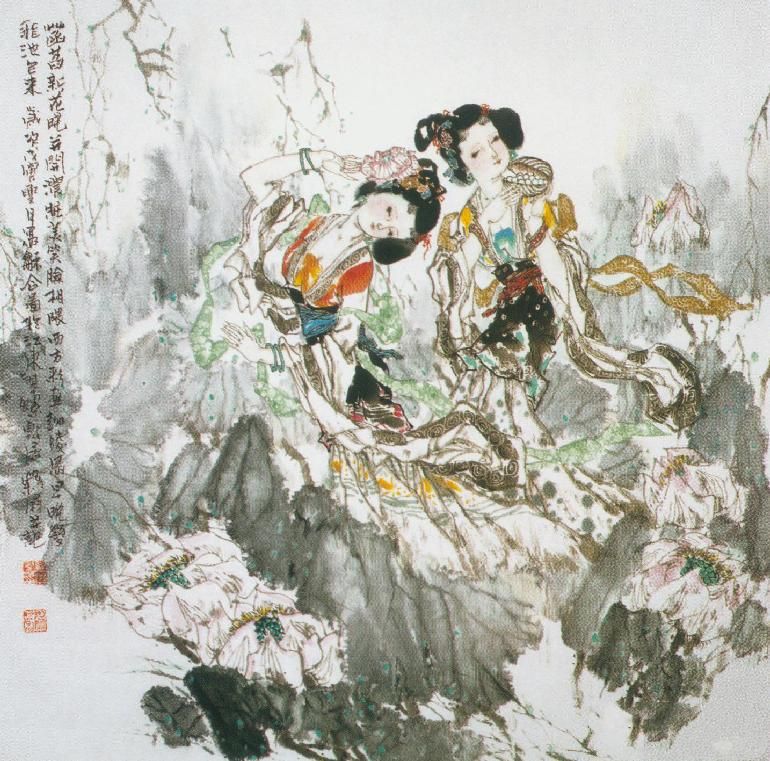 罗屏《双荷图》: 罗屏先生是中国近代著名画家,是一位人物、山水、花鸟兼长的画家。在他的古典人物画中,或以山川飞瀑的雄伟峭拔来烘托人物的胸襟气度,或以花香鸟语的清新雅丽来渲染人物的心境情愫。景与情融、人与物合,笔精墨妙,浑然天成,画面溢出浓厚的诗情画意,给人一种妙语连珠、赏心悦目的美感。在这件作品中,两位少女宛如花中仙子,婀娜多姿,妩媚动人,画家以水墨、白描、淡彩的形式使她们神情、动态与白荷的象征意味达到了有趣的谐合,从而把诗情画意提升到了新的艺术高度。