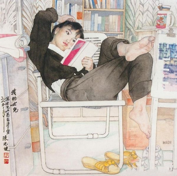 陈光健《我的女儿》:陈光健是中国近代著名的女画家,她的画风严谨而不呆滞,活泼而不俗气,长于用线,优美而有节奏。她的工笔人物创作努力扪触生活的心音,捕捉时代的脉搏。对人物审美,注意富有生活情趣和个性内涵。她的舞蹈人物画风流多姿用笔洒脱。这件作品以多层次的墨色渲染加透明颜料绘制而成。画面效果清雅宜人,特别是头、手、脚的渲染更加强了这幅画的生活气息,自然生动,表现了画家对自己女儿的疼爱和关怀,体现了艺术从生活中来、又高于生活的艺术真谛。女儿坐姿的随意,表情的专注,表明了家庭生活的幸福和美满。