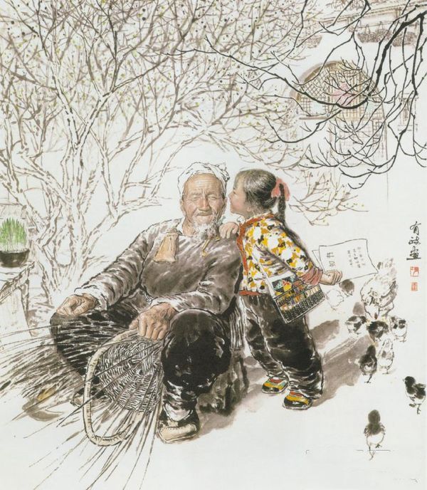 王有政《悄悄话》:王有政先生的这件作品荣获五届全国美术作品展二等奖,为他的代表作品之一。作品描绘的是祖孙两说悄悄话的场景。作品中小女孩手拿作业本,趴在爷爷的耳边说悄悄话,显得天真无邪而又充满童趣。正在编竹筐的老人侧身倾听,脸上洋溢着幸福的微笑。背景是农家小院,树木,花盆以及跟随母鸡觅食的小鸡仔,使画面显现出鲜活的生活气息,令者深受感染。
