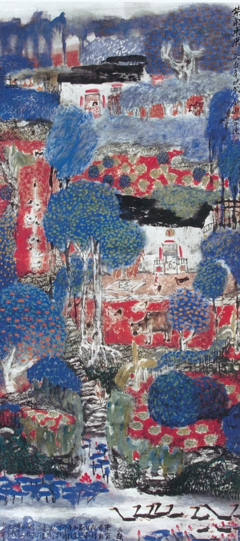 珠峰颂《紫气东来》作品介绍:纸本,设色;纵180厘米,横 90厘米;作于1993年;藏于画家自藏。