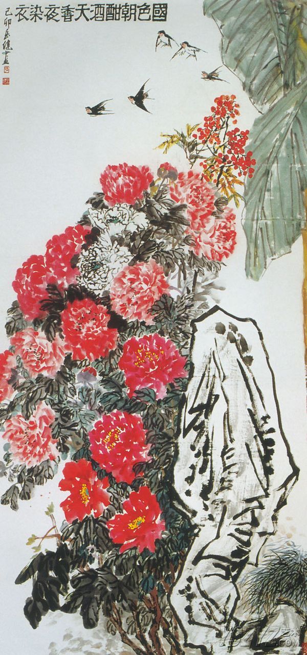 张岳键《国色天香》:这件作品为张岳键先生的代表作品之一,为他专为建国50周年大庆而作,作品曾参加在杭州举行的中国画展。作品中的主角是百花之王“牡丹”,为创作好这件作品充分反映牡丹的丽质丰神,作者曾专程赴河南洛阳参观满园盛开的牡丹,对景写生,收获很大。画面的左上方是几片芭蕉叶,右下方是一块勾、皴而成的怪石,在怪石边上是一簇盛开的牡丹,万紫千红,妍丽无比,在花丛的上方是几只轻盈飞翔的燕子,画家以国色天香的牡丹喻祖国今天,以报春的燕子象征着祖国更辉煌的明天。可以说这幅画热情地歌颂了祖国的繁荣昌盛,前程似锦。