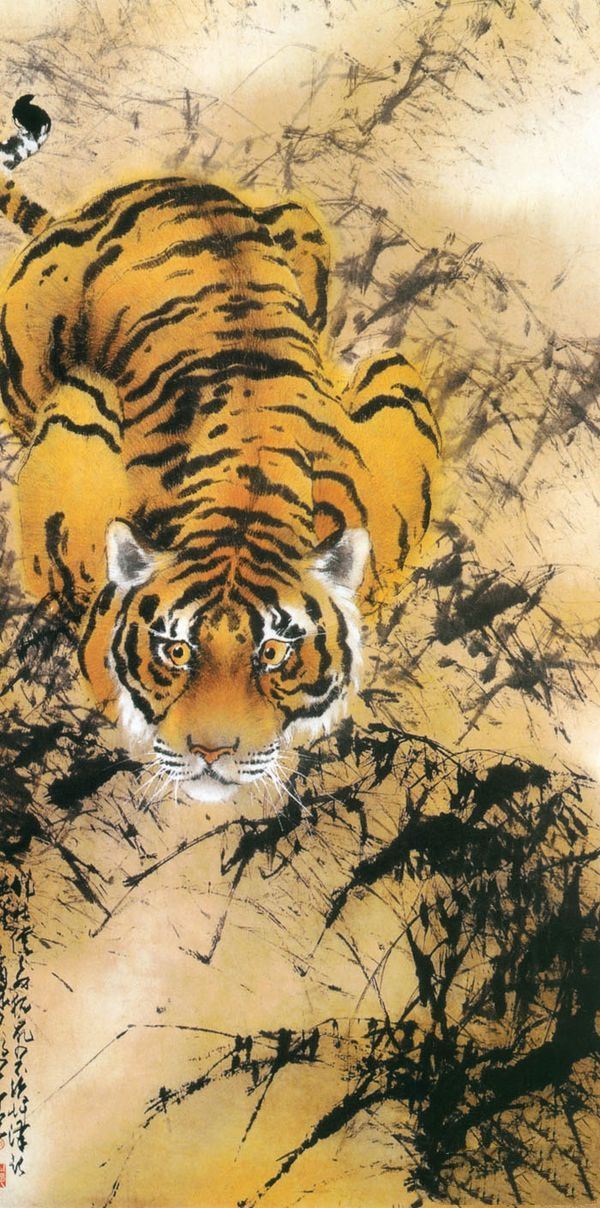 赵少昂《自有雄风藏草泽》:赵少昂先生是中国近代著名画家,他擅花鸟、走兽, 继承岭南画派的传统,主张革新中国画。他的画能融汇古今,并汲取外国绘画的表现形式,同时又注重师法造化。作品笔墨简练、生动,形神兼备,深受人们的欢迎。此作描绘的是一只伏在草丛中寻找猎物的东北虎。画面构图饱满,以西洋写实画法,刻画猛虎的富于变化而又生动真实的形象。老虎两耳竖起,双目放光,威猛之中显得浑厚大方,毫无狞恶之感,可以说是表现了虎的“雄伟”之美。虎皮的光泽、丛草的散乱相互对比,达到了使形体逼真而又生机勃勃的效果。